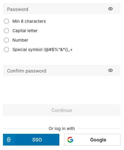 You may choose to enter a unique password to use when logging in. A strong password containing a minimum of eight (8) characters with at least one (1) number and at least one (1) special symbol. - SSO & Google