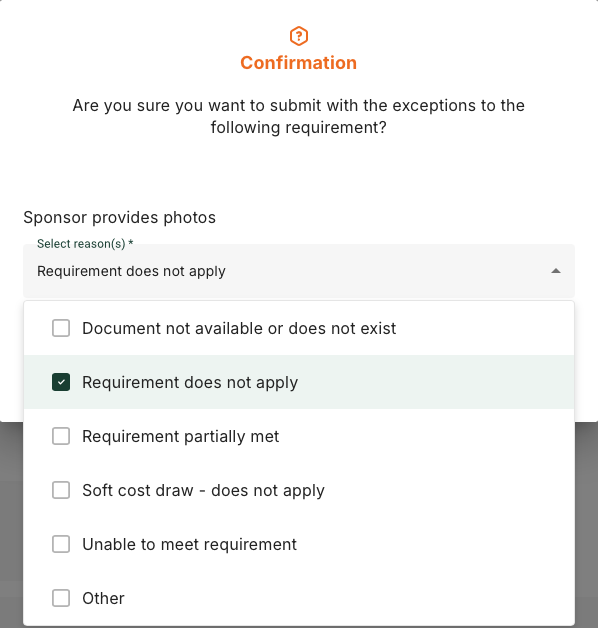 You will be taken to the Policies Page. These are the requirements set by your Lender that must be fulfilled before you are able to Submit the Draw. There will always be 3 default policies in addition to any requirements from the Lender: