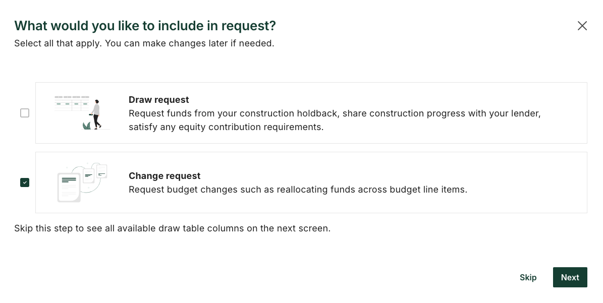 NOTE: The Change Request feature should only be used when reallocating your budget or submitting a draw request. You can submit for both a budget change request and a draw request at the same time by clicking the Request button and choosing both options.